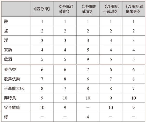 這十條戒的順序是:不殺、不盜、不婬、不妄語、不飲酒、不著華香瓔珞、不歌舞伎樂不往看、不坐高廣大床、不非時食、不捉金銀錢。將此《四分律》的十戒文,和前述四本中戒條順序作一對照,如下表: