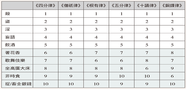 從表中可見,各律的前五條戒,順序完全相同;後五條戒,差異較大。其中差異最大的是《銅鍱律》—《銅鍱律》特別將「非時食戒」提到了五戒後的第六條位置,顯示了對「非時食戒」的強調,和其他各律均不同。其他各律中,《僧祇律》和《四分律》順序完全相同;《根有律》和《四分律》、《僧祇律》間只有兩條戒的順序不同,其他一致。《五分律》和《十誦律》之間也僅有兩條戒順序不同,其他一致。如此,各部律中沙彌十戒的內容,可以分成三大類:《四分律》、《僧祇律》、《根有律》是一類;《五分律》、《十誦律》是一類;《銅鍱律》單獨成為一類。