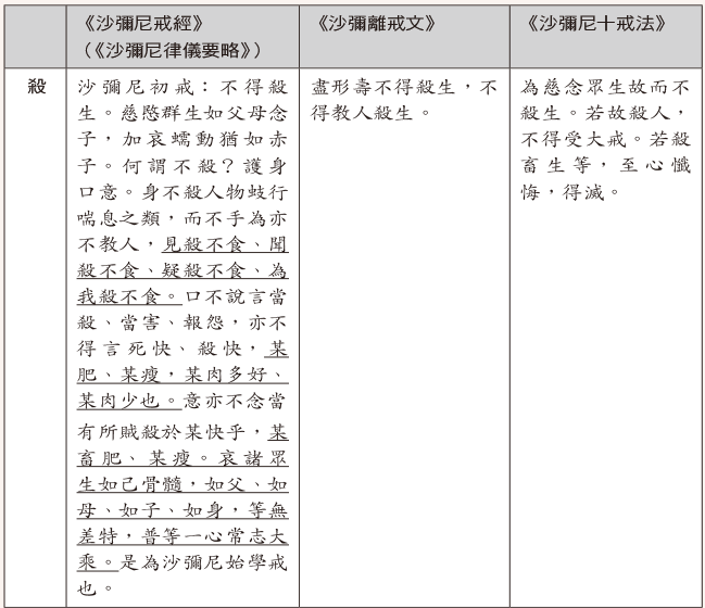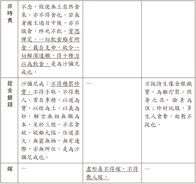 各本沙彌尼戒,除了順序有不同,戒文的文字、內容,也有很大差異。以下將三本獨立的戒文對照如下表: