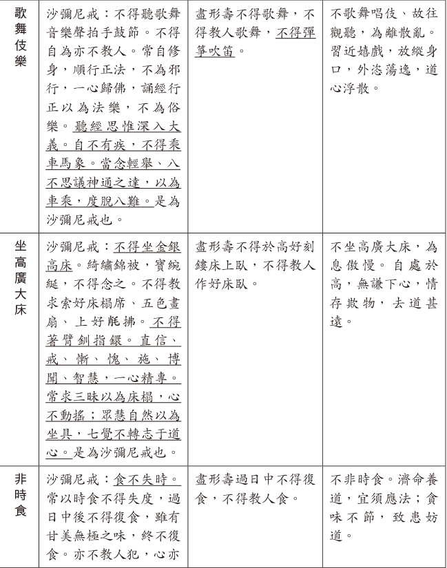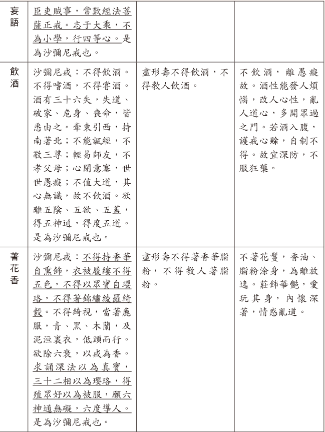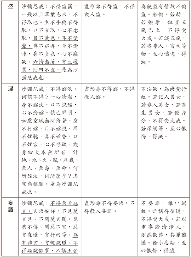 通過上表可以發現,《沙彌尼戒經》中的「不得兩舌惡言」、「不得持香華自熏飾」、「不得聽歌舞音樂聲拍手鼓節」、「不得坐金銀高床」、「食不失時」、「不得積聚珍寶」等戒文,明顯和其他兩部不同,有自己鮮明的特色;另外,戒文中增加不少大乘法的內容,如「哀諸眾生如己骨髓,如父、如母、如子、如身,等無差特,普等一心常志大乘」,「不得論說俗事,不講王者臣吏賊事,常歎經法菩薩正戒;志于大乘,不為小學,行四等心」,「求誦深法以為真寶,三十二相以為瓔珞,得殖眾好以為被服,願六神通無礙,六度導人」,甚至增加很多開導性和訓誡的文辭,皆超出了一般沙彌戒文的範圍;但是,在沙彌尼戒的戒相和判罪部分,則未有清晰的指引,有所不足。