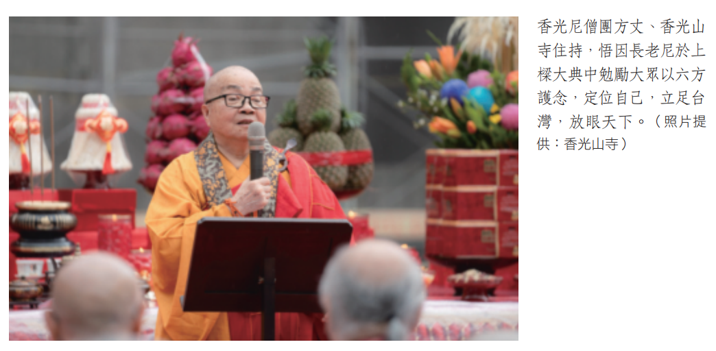 香光尼僧團方丈暨香光山寺住持悟因長老尼慈悲開示:「今日上樑大典之時所提出的『六方護念』,即對應父母、師長、配偶、朋友、職場和僧侶的關係,這是佛教中基本的人倫道理,亦是戒律的體現。願這座大殿的莊嚴與神聖,從建成的過程中能反思自己的人生與修行,讓自己的存在和這裡的每一個元素都能緊密相連。」