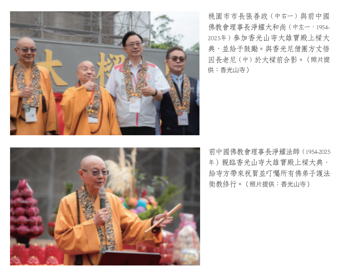 桃園大溪香光山寺於民國113年9月22日舉行大雄寶殿上樑大典,全台各地佛教諸山長老,包含中國佛教會理事長淨耀長老和尚等法師、社會賢達、護法居士,以及桃園市長張善政、監察委員賴鼎銘、立法委員萬美玲及前立法委員翁重鈞等地方政府代表,親臨會場給予祝福。
