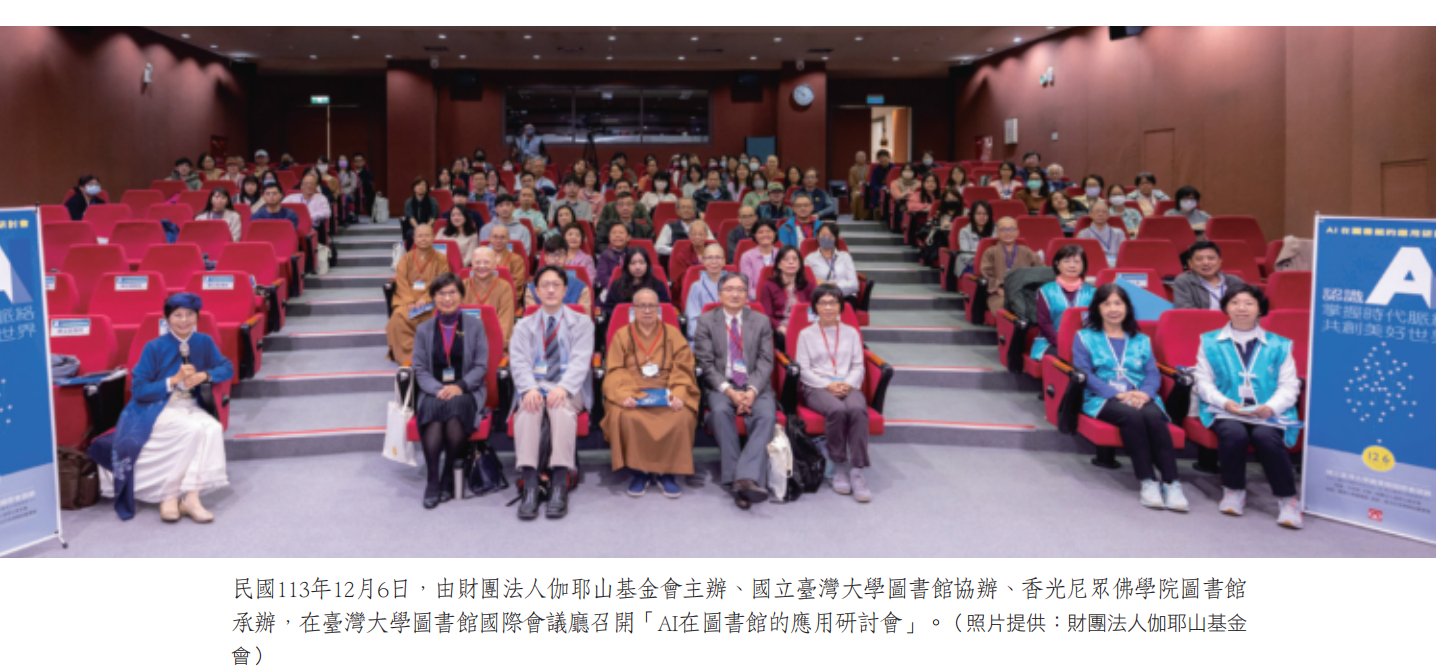 在AI技術發展的時代浪潮下,圖書館的角色定位與功能正在經歷深刻的變革。為有效提升圖書館的服務水準和管理效能,「AI在圖書館的應用研討會」於民國113年12月6日,在臺灣大學圖書館國際會議廳隆重召開。此次研討會由財團法人伽耶山基金會主辦、國立臺灣大學圖書館協辦、香光尼眾佛學院圖書館承辦,其核心目的在於強化圖書館從業人員的專業服務能力,以更好地適應新時代的需求。