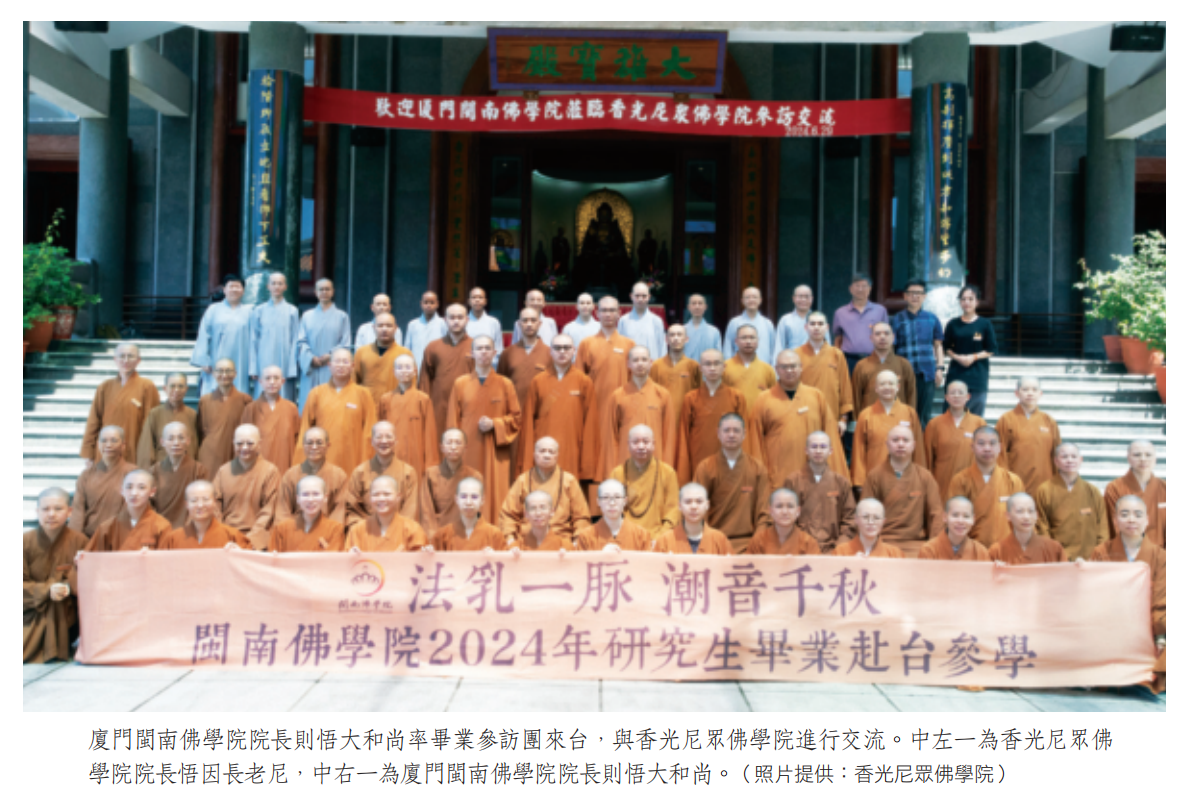廈門閩南佛學院院長則悟大和尚一行44人組成「法乳一脈.潮音千秋」畢業參訪團來台,與香光尼眾佛學院進行交流。民國113年6月29日,參訪團抵達香光寺,受到香光尼眾佛學院院長悟因長老尼及師生們的歡迎,並獲贈出版品。則悟大和尚感念悟因長老尼當年對閩南佛學院女眾部的協助,特地安排到香光尼眾佛學院交流,並回贈書法卷軸及研究成果。