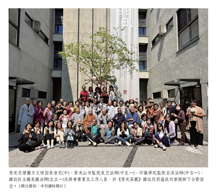 為感謝各界長期以來的護持與陪伴,活動中特別設計並製作一枚「空之間印章」,由悟因長老尼親手致贈給到場貴賓。這枚印章不僅是一份精心準備的紀念品,更承載著對過去四十年歲月的致敬,象徵一份深厚情誼,以及對未來弘法之路的祝福。許多與會者表示,這枚印章不僅珍貴,更是一段歷史的見證,凝聚了《香光莊嚴》雜誌在傳承與創新中不斷前行的精神。典禮最後,眾人移步至雜誌社前那棵盛放的紫薇樹下,在和煦陽光與鳥語花香中,與會貴賓與工作人員歡聚一堂,高聲合唱,笑聲不斷。鏡頭定格在每一張洋溢著喜悅與感恩的笑臉,這張大合照,為整場典禮畫下溫馨而圓滿的句點,也為《香光莊嚴》雜誌的未來,寫下充滿希望的序章。