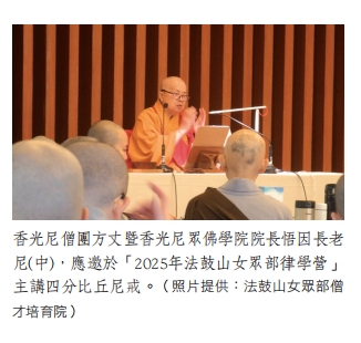 香光尼僧團方丈暨香光尼眾佛學院院長悟因長老尼,應邀於「2025年法鼓山女眾部律學營」主講四分比丘尼戒。本屆營隊由法鼓山女眾部僧才培育院主辦,於4月14日至16日在法鼓山世界佛教教育園區舉行,共有92位來自法鼓山各分院執事僧法師參與。