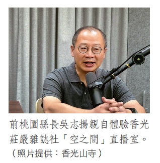 民國114年8月11日(星期一),前桃園縣長吳志揚蒞臨香光莊嚴雜誌社「空之間」工作室,參與香光山寺護法會運作座談。他與香光山寺監院見竺法師以及多位法師、護法會幹部展開了深入交流。