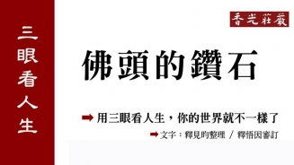 2014.03.08 34 30 33 28 26 27 31 29 24 23 22 21 20 17 19 18 32 25 16 15 14 13 18 【三眼看人生】夫唱、婦不隨 中國民間神話的二郎神額頭有第三隻眼,佛教的教主釋迦牟尼佛有五眼,肉眼、天眼、慧眼、法眼、佛眼。 從這些不同的眼,看到了不同層次的世界。 悟因法師受學於當代獨步楞嚴、傳臨濟法脈的白公老人座下,常能以不一樣的眼光看世界。因此採擷師與弟子、時人的對話作成語錄,名為「三眼看人生」。 三眼,指跳脫自己和他人的眼光來看事情。 文中的「師」指悟因法師。 Facebook 相關影音 2013.07.27 智慧法語 【三眼看人生】誰比較忙碌 2013.06.15 智慧法語 【三眼看人生】佛頭的鑽石 2013.10.30 智慧法語 【偈頌之美】禪詩-南臺靜坐