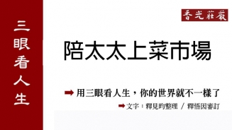 2013.08.24 12 11 10 9 8 7 6 5 4 3 2 1 【三眼看人生】鵝菜 文字:釋見昀整理;釋悟因審訂 用三眼看人生,你的世界就不一樣了。 中國民間神話的二郎神額頭有第三隻眼,佛教的教主釋迦牟尼佛有五眼,肉眼、天眼、慧眼、法眼、佛眼。 從這些不同的眼,看到了不同層次的世界。 悟因法師受學於當代獨步楞嚴、傳臨濟法脈的白公老人座下,常能以不一樣的眼光看世界。因此採擷師與弟子、時人的對話作成語錄,名為「三眼看人生」。 三眼,指跳脫自己和他人的眼光來看事情。 文中的「師」指悟因法師。 Facebook 相關影音 2014.02.15 智慧法語 【三眼看人生】迎賓五葉松 2014.03.22 智慧法語 【三眼看人生】陪太太上菜市場 2013.10.30 智慧法語 【偈頌之美】禪詩-平常是道