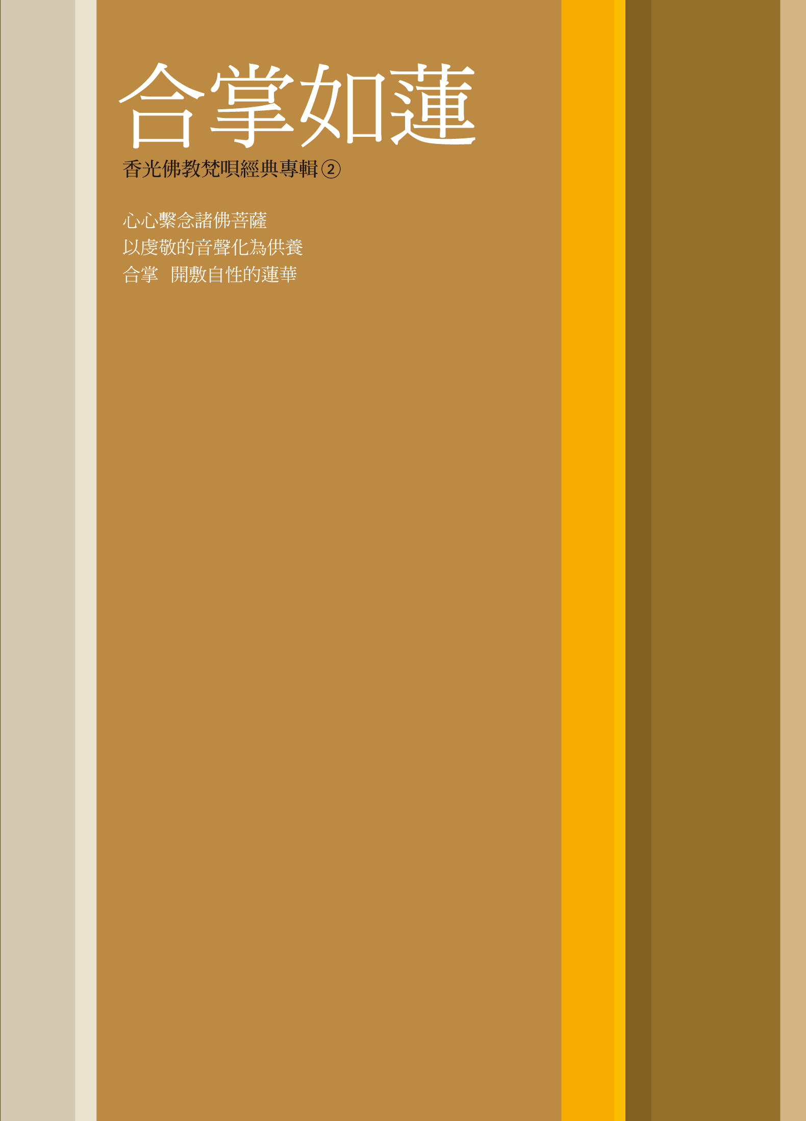 102 期 X出刊日期 2010 06 20 合掌如蓮:香光佛教梵唄經典專輯2 心心繫念諸佛菩薩 以虔敬的音聲化為供養 合掌開敷自性的蓮華 你用左耳還是右耳聽電話?總要鬧鐘響了十分鐘後才起床? 你還是喜歡坐在咖啡館左邊的那個角落? 日日年年,哪些習慣的總和成為現在的你? 在信仰裡,若你也能培養一個如每天刷牙、吃飯的習慣,人生會有什麼不同? 願您跟隨本張專輯莊嚴安定的梵唄音聲,讓心習慣趨向善法,親近彌陀。 其他 - 出版序 您可以這樣做定課 其他 - 曲目及梵唱 合掌如蓮曲目